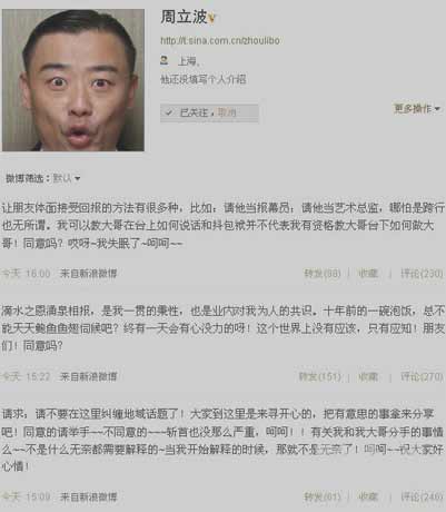 采訪首先圍繞關周分手。周立波說:“我很無辜,老關也很無辜,有人在中間挑事,我們會查的!彼嬖V記者,知道媒體“踢爆”兩人分手一事時,他正在與前紐約警察局華人局長莫虎一起喝酒,而當天下午他剛在無畏號航母上看了“珍珠港事件”的紀錄片,當時他的第一個反應是“沒想到我也遇上珍珠港事件了”。由于當時認為是關棟天向媒體“踢爆”此事,而且當晚酒喝得比較多,因而在微博上寫下了幾段很有爭議的博文,包括“泡飯鮑魚”說。“結果阿春(孫徐春)用人格向我擔保決不是‘老怪頭’(周立波和孫徐春對關棟天的昵稱)說出去的,我相信他。”周立波表示,此次分手只是藝術和商業上的分手,兩人的藝術觀點不同。