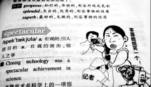 臺(tái)灣“今日新聞”消息稱,英文書(shū)中芙蓉姐姐的漫畫(huà)像斜眼、噘嘴不屑一顧的模樣,還有記者環(huán)繞在旁,右邊寫(xiě)著“芙蓉姐姐笑一個(gè)”,左邊則出現(xiàn)英文單字“spectacular”,翻成中文是形容詞壯觀的、引人注目的以及名詞驚人之舉,夸張的畫(huà)像和本尊幾乎一模一樣,芙蓉姐姐卻說(shuō)教科書(shū)把她畫(huà)丑了,而網(wǎng)友則是驚呼不可思議。