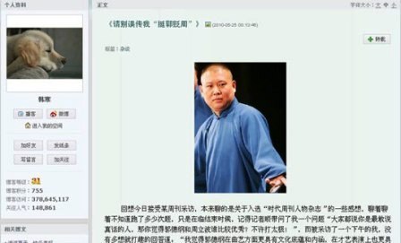 繼韓寒“被封時(shí)代周刊影響人物”事件之后,昨日有網(wǎng)友在論壇瘋狂轉(zhuǎn)載韓寒的最新博文《請(qǐng)別誤傳我“挺郭貶周”》的相關(guān)博客截圖和內(nèi)容,該帖子在網(wǎng)上引起了廣泛的熱議,因?yàn)轫n寒在文中還意外曝出周立波曾和郭德綱在爭(zhēng)演迪斯尼電影《歌舞青春》一角色時(shí)、私下相互較勁并以自降身價(jià)“零報(bào)酬”方式搶戲的相關(guān)內(nèi)幕,被網(wǎng)友戲稱為“郭周搶角門”。不過(guò)記者上網(wǎng)發(fā)現(xiàn)韓寒博客中的這篇博文已經(jīng)被刪除,為了進(jìn)一步求證博文內(nèi)情及真?zhèn),記者試圖聯(lián)系韓寒,不過(guò)其手機(jī)一直處于呼叫轉(zhuǎn)移留言狀態(tài),隨后記者通過(guò)手機(jī)和博客發(fā)短信留言采訪,截至發(fā)稿時(shí),韓寒方面并未給予回應(yīng)。