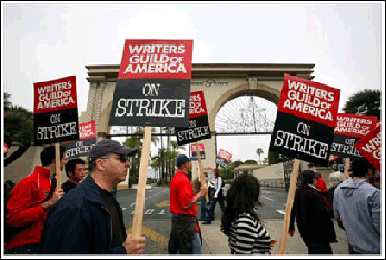 說起來讓人難以置信,罷工的起因是由于稿酬和版稅,而焦點(diǎn)卻在區(qū)區(qū)四美分。根據(jù)報道,編劇們要求在原先售出每張碟片可獲四美分版稅的基礎(chǔ)上,再加四美分。但這個小小的要求居然被“電影暨電視制作人聯(lián)盟”否決了。當(dāng)然編劇們還有一些其他的要求。最后談判破裂,導(dǎo)致罷工開始,劇作家們走上街頭。
