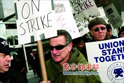 這是由美國編劇大罷工作為誘因,爆發的另一宗美國娛樂界的罷工事件。在編劇大罷工的隊伍里,聲援的力量越來越大:第一天“丑女貝蒂”為編劇吶喊,隨后“絕望主婦”成員送披薩餅表示支持,事件繼而引起了加州州長施瓦辛格介入調停,連隊伍大牌且龐大的演員工會都加入其中,羅賓·威廉姆斯也來高舉紙牌。大罷工產生的負面影響逐漸強烈。