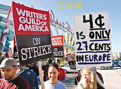 中新網(wǎng)11月14日電 因DVD及網(wǎng)絡(luò)下載等利益分帳無(wú)法達(dá)成共識(shí),美國(guó)作家協(xié)會(huì)和影視監(jiān)制聯(lián)盟的關(guān)系破裂問(wèn)題已進(jìn)入第8日,不少人都堅(jiān)持每天在好萊塢片廠門前示威。只是監(jiān)制聯(lián)盟方面現(xiàn)已作出還擊,前日于兩份業(yè)內(nèi)刊物《Varitey》與《The Hollywood Reporter》刊登全版廣告重申立場(chǎng),宣稱編劇們?cè)缫勋@得影視作品被下載時(shí)的收益。