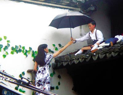 昨日的一場戲,是秦嵐和劇中的兒子吳磊拍對手戲。由于天氣炎熱,秦嵐說雖有洋傘遮陽,但妝還是化得很快。小演員吳磊當天很是不適,拍到最后竟然中暑,又吐又哭,忙壞了劇組的工作人員。按照劇情,秦嵐要從屋頂上往下跳,盡管劇組為她請了替身,但為了追求真實和進度,秦嵐親自上陣,從數米高的地方往下跳,這場戲總算結束。
