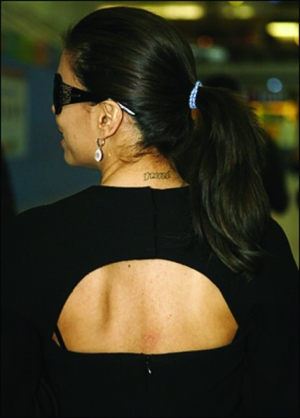 愛的文身,這一招早就不新鮮了。不過,在三級片、性丑聞這樣的陰影之下,“瘋狂主婦”伊娃還是使出了這一招,文的是她球星老公托尼的球衣號碼9(NINE)。最近她和辣妹維多利亞走得很近,估計是偷學了一招。