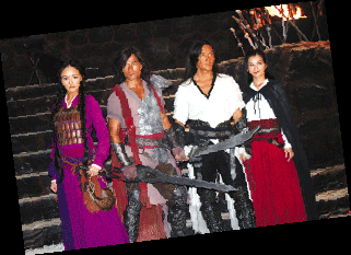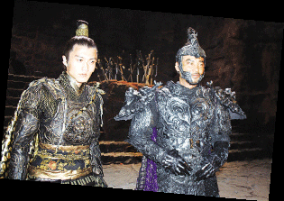 走進一間已經(jīng)被布置成刑房的攝影棚,巖石碎塊構成了粗糙的地面,幾把劍插成了劍壇,臺階上火爐冒著火苗,空中還懸著幾塊爬著蟲蛆的火腿,幾臺鼓風機正開足馬力吹著風……看前面,一堆人正在你推我一把,我攻你一招,原來替身正在幫任達華試戲。對披著長發(fā)造型的鄭伊健、郭富城以及何家勁來說,炎熱恰是專門跟耍帥作對的。問到郭富城對于造型的看法,郭富城當即冒出一句“非常熱”。現(xiàn)場汗流浹背的阿Sa抱怨說,飾演聶風的鄭伊健可謂是片中最舒服的一位,不僅戲服相對清涼,由于名為“風”,因此拍戲的時候可以充分享受鼓風機的待遇。