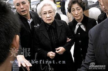 大廳內的墻上掛著謝導的遺像,謝晉的遺體邊遍布鮮花,老人戴著眼鏡,就好像睡著了一般,旁邊還放著他最鐘愛的一頂帽子。一點十分左右,謝晉妻子徐大雯和其小兒子阿四到達追悼會現場,強掩住內心的悲傷,送謝導最后一程。這幾天,徐大雯堅持從醫院出來,親自參與布置靈堂,盡管她剛剛安裝了心臟起搏器,精神狀態很不好。徐大雯這些天說得最多話是:“我不能倒,這個家總得有一個人撐著。”昨日,一直表現堅強的徐大雯顯得非常憔悴,頭發花白,走路蹣跚,對著謝晉的遺體說了不少話。