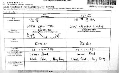 倪震發表結婚聲明后,19日,香港記者在金鐘婚姻登記處發現倪震和周慧敏簽下的擬結婚通知書。登記處職員表示,簽下通知書后男女雙方最快17天以后正式成為夫婦。