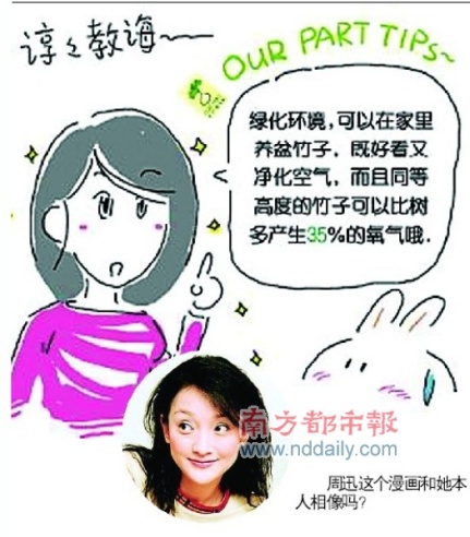 周迅日前推出“周粥”合作———和國內當紅漫畫家胖兔子粥粥合作漫畫專欄,推廣環保意識。