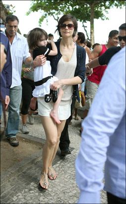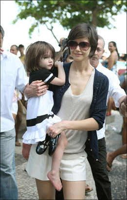 正在巴西度假的凱蒂·赫爾姆斯昨日(2月2日)帶著自己可愛的小女兒在巴西的海灘上悠閑的走著,白色的短褲襯得美腿秀場,藍色的外衣輕巧的抵擋這紫外線的困擾,半臉墨鏡體現非凡氣質,一雙阿瑟丁·阿拉亞涼鞋提升品味,活脫脫一個高大版的芭比娃娃。而懷中抱著的孩子簡直就是天使降臨,粉嫩的皮膚,配上白色的小裙子,可愛至極。