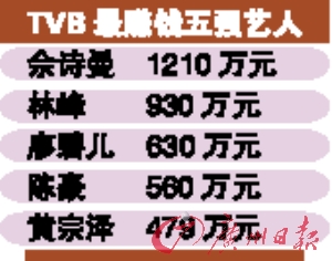 陳豪和廖碧兒也不介意以情侶檔公開露面和合作,兩人收入都在前5。而去年都入前5的郭晉安和胡杏兒,郭晉安因牽掛兒子而減少工作,胡杏兒因沒有代表作,雙雙跌出5強。