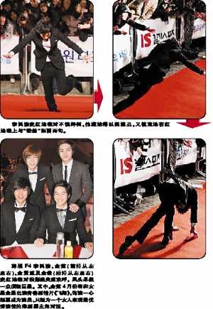 有 “韓國金球獎”之稱的第45屆百想藝術大獎,2月27日在首爾奧林匹克公園舉行,朱鎮模憑古裝愛情片《霜花店》首次登上影帝寶座,憑《妻子結婚了》獲頒青龍影后的孫藝珍亦再下一城成功封后。不過,若論風頭,眾星就始終不敵《花樣男子》捧紅的韓版F4。四子以一身官仔骨骨的黑西裝走紅地毯,兩旁影迷及傳媒已尖叫不斷,有“粉絲”為見偶像不惜爬上樹又站上凳子,期間“粉絲”互相推撞,險釀成意外。把頭發燙直的“韓版道明寺”李民浩大概是興奮過頭,走紅地毯時不慎被階梯絆倒,大出洋相。幸好這一跌跌得有價值,他擊敗《花》劇中的好兄弟金范捧走電視組別最佳男新人獎,名副其實“仆倒攞獎”!李民浩領獎時表現激動,更不介意提及糗事,為紅地毯摔倒一事致歉。至于“韓版花澤類”金賢重就奪得最佳電視人氣獎。