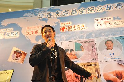 在活動現場,李連杰與觸動傳媒聯袂揭曉了6枚一套的慈善紀念郵票。據了解,這套郵票限量10萬套,定價為111元一套。這個價錢是李連杰要求的,因為111元符合壹基金“每1人+每1個月+每1元=1個大家庭”的理念,而該郵票實際面值超過60元。在昨天的活動上還發生了一段小插曲,一名來自西安的女粉絲在參與觀眾提問環節時向李連杰“示愛”。該粉絲拿到話筒后就顯得很激動,全身上下不停地抖動,在哆嗦了半天后她大喊:“我是你西安的影迷,我從小就喜歡看你的電影,我好崇拜你,我夢想就是找到像你這樣的老公!贝嗽捯怀鲎層衅抻信睦钸B杰很尷尬,他只好在臺上傻笑。過了幾十秒,李連杰才蹦出兩個字“謝謝”。