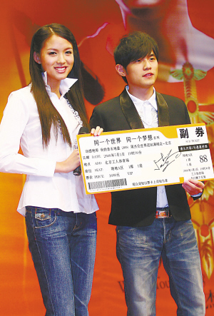 周杰倫在現場把首張VIP門票送給了新晉世界小姐張梓琳。記者 郭延冰 攝