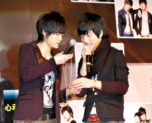 2007年10月22日,由“加油好男兒”的井柏然和付辛博組成的偶像團(tuán)體BOBO組合在北京舉辦了他們的首唱會。會上他們不僅載歌載舞與歌迷互動,還收到了大師兄羽泉組合送來的禮物。 中新社發(fā) 一可 攝
