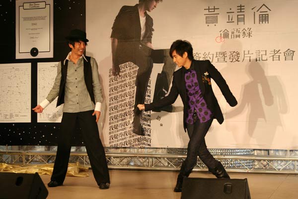 隨后記者會的重頭戲---簽約儀式正式開始,華納唱片大中華總經理王蓓芬(帕梅拉)和黃靖倫一起走到背板的右后方,兩人一同揭開星星布幕,亮出星型的合約書,在大家的見證下簽名,代表華納唱片正式簽下這位“超級星光大道”第三屆最閃亮的一顆星,并象征黃靖倫將成為歌壇閃耀的一顆星星,希望他用簡單的歌聲打動人心。帕梅拉大費周張買了一顆價值1萬美金的“星星”當做禮物送給黃靖倫,這顆特別為黃靖倫訂購的星星以黃靖倫英文名“JING”命名。收下了這個特別的禮物,黃靖倫感動的說不出話,不敢相信自己擁有了一顆“真的星星”。 除此之外,華納音樂更是準備了另一項大禮:當主持人宣布歡迎知名舞蹈老師張勝豐出場時,黃靖倫還有點訝異,原來是唱片公司認為黃靖倫會唱又很會說話,但唯一欠缺的就是肢體動作,在他身上總是會發現同手同腳、舞步不在節奏上的情形。然而,既然要發片成為正式的歌手,當然不可以忽略這個部份。張勝豐老師搞笑地拿出節拍器當場要黃靖倫SOLO一段舞步讓老師看看,臺下歌迷也不斷鼓噪著,黃靖倫跟著老師的示范動作做一次,果真很不協調,完全不在拍子上,笑得杉哥在一旁大方宣布:“舞蹈集訓沒有期限,讓靖倫上課上到擺脫肢障封號為止。”逗得全場哈哈大笑。