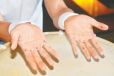 中新網3月24日電 吳尊上月底在香港紅館的“飛輪海”演唱會中,因吊鋼絲時發生意外,左腳板的左側骨出現1道裂痕,不能跳舞的他昨特別為本周六的馬來西亞演唱會排練打戰鼓,結果他為練鼓而導致雙手多達11處破皮傷口,他苦笑說:“我的腰也因使力不當而肌肉拉傷。”