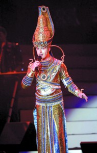 作為一個擁有自己時裝品牌的設(shè)計師,維塔斯的每次亮相都給人以華麗之感。昨晚,他更是頻繁換裝,從太空人造型到金燦燦的宮廷服裝以及鑲滿亮鉆的禮服,充分展現(xiàn)其王子形象。不過他每次唱完一兩首歌就要下臺換裝,空留樂隊在臺上演奏,樂隊一曲奏畢,他仍然沒有現(xiàn)身,幾度出現(xiàn)空場的情況。起先場下觀眾會禮節(jié)性地報以掌聲,但兩三次之后,有些觀眾便不耐煩地吹起口哨。好在每一次維塔斯重返舞臺,都能迅速抓回觀眾。