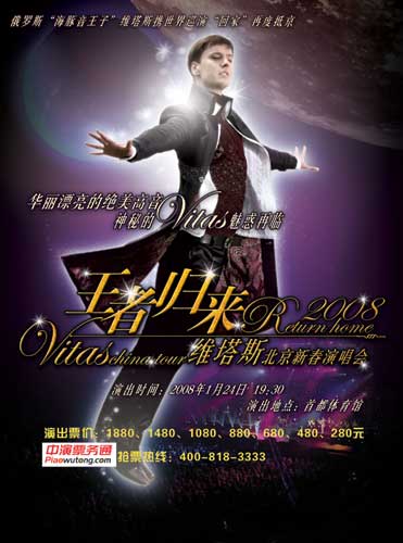 2007年6月之后,無數(shù)“粉絲”引頸期盼的下一輪巡演,在制作人曾經(jīng)神秘的透漏“未來四年內(nèi)將不會再來中國”的惋惜聲中,這次卻以迅雷不及掩耳的速度,將于第一輪巡演后半年再度展開。08年1月的首都體育館,將再次為維塔斯的高音歌聲所震撼。