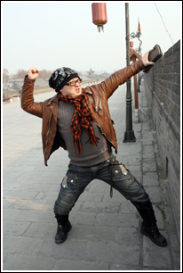 一身嬉皮風格的裝扮,加上一副超大的黑框眼鏡,彭波看上去帶有明顯的“謝小盟后遺癥”。雖然只來過西安兩次,但彭波非常喜歡西安。去年在西安拍了一個多月電影,他已把城里好吃好玩的地方摸了個門兒清。他說:“好吃的太多,滿街都是美女。西安人爽快、實在,在這交了不少朋友,國力隊的江洪就是我哥哥。我已把這里弄得跟自己家一樣了,到處都特別熟。”