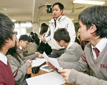 香港屯門中華基督教會譚李麗芬中學18日開課,校方安排學生閱讀剪報及分組討論,也帶領學生為裸照案中的受害人祈禱。(圖片來源:明報)