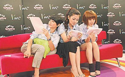 中新網9月26日電 S.H.E最近成立自己的網絡電臺,其中有1天的節目和im.tv合作,讓粉絲能“看”到她們主持的模樣。準備錄音時,Hebe(右起)和Selina認真研讀主持稿,只有Ella脫鞋又摳腳,還倒在Selina身上,坐沒坐相。這些畫面要是上網大放送,真會大傷形象。