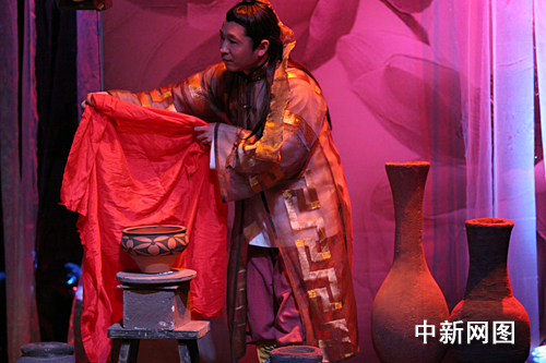 該劇是以發(fā)生在澠池仰韶村一個陶藝世家的制陶故事為背景,通過秦王的兒子邂逅彩陶女所產(chǎn)生的愛情故事為主線,整個劇情起伏跌宕,臺詞風趣幽默,令觀眾沉醉在悲喜交加的人物命運中。影視戲劇演員張成曉勇的精彩演繹博得了全場觀眾的陣陣掌聲和喝彩。當絢麗的舞臺燈光變幻出滿場旋轉(zhuǎn)的來自澠池縣仰韶村彩陶坊的精美彩陶時,把整個劇情推向了高潮,令在場的首都觀眾驚嘆不已。樸拙俊美的仰韶彩陶的確是在金黃的季節(jié)里給首都的觀眾上了一道視覺文化大餐。
