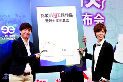 昨日,郭敬明簽約天娛儀式在北京舉行。此次郭敬明不僅成為藝人,還成為了天娛的文學總監及創作總監。對于之前一直傳出的郭敬明將出演《新流星花園》花澤類的消息,在發布會上,郭敬明予以否認。而天娛的負責人龍丹妮也表示目前還沒有和郭敬明談《新流星花園》的演出,不過郭敬明可能要在這部電視劇中客串一個小角色。