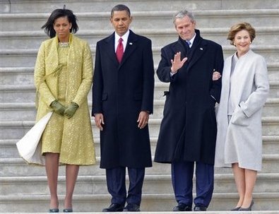 而作為離任的總統(tǒng)布什與勞拉的著裝讓人矚目,尤其是勞拉選擇素雅的淺灰色套裝,非常完美的展現(xiàn)了她柔和、高雅的氣質(zhì),而簡(jiǎn)潔的款式與剪裁讓她看上去非常平和,似乎預(yù)示著她離去前平和的心態(tài)。