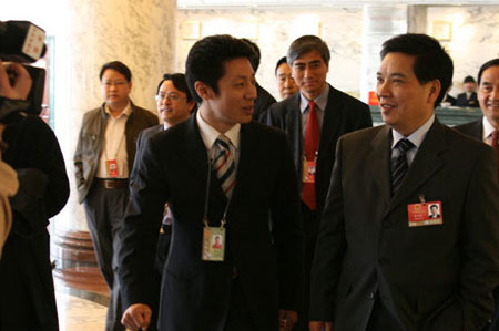 點評:棕色西服的設計和顏色不是很好,領子設計得不好,使得衣服線條下垂,十分顯老。而且,里邊的襯衣領子翻出來,顯得很累贅。不過,這種素氣的著裝比較符合兩會嚴肅的氛圍。