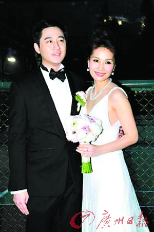一對新人于當晚6時許接受記者訪問。消瘦了不少的Fiona穿上Dorian Ho設計的V領婚紗,搭配由PASPALEY贊助的價值200多萬港元的珍珠項鏈現身,打扮雍容華貴。當記者要求新人接吻拍照時,新郎因害羞不肯就范,最后要Fiona嘟嘴作親嘴狀。Fiona透露:“婆婆送了一塊勞力士手表給我,代表要添丁。”