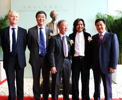 中新網9月29日電 據(jù)寧夏僑聯(lián)消息,9月27日,香港中文大學舉行了高錕雕像揭幕典禮,由諾貝爾物理學獎高錕伉儷、校長沈祖堯教授及著名雕塑家吳為山教授主禮,中國僑聯(lián)副主席朱奕龍應邀參加揭幕儀式,與中大校領導、教授以及人文學者等師生代表近百余人共襄盛舉。