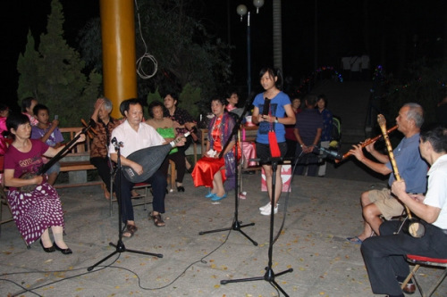 在金川前的小廣場上,文藝晚會依舊豐富多彩,激情動感的舞蹈、詼諧幽默的小品、悠揚美妙的器樂彈唱贏來了一波又一波的掌聲和笑聲。而在秋中湖旁的小涼亭里,有支特別的樂隊也吸引了不少老師學生駐足聆聽,他們是由華僑大學退休教職工組成的南音演奏社。老人家們彈著琵琶,吹著筒蕭,拉著二弦三弦,吟唱一首又一首韻味悠長的南音樂曲。來自橋南小學的幾名學生也來助陣,老少合作的表演別樣溫馨。今年已經七十一歲的張彬彬女士表示,他們同是喜愛南音的老職工,她退休以來已經學了七八年的南音了,能把南音這一傳統文化傳播給更多人,他們都很開心。
