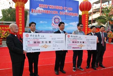 慶典現場上,鄺文熾先生以97歲的高齡,真情訴說著紅藍兒女與培正的綿綿情意,在展望臺山培正學校美好未來時,鄺老當即現場捐出人民幣100萬元,這一義舉引來一片喝彩,也讓在場人士無不為之動容。在他的帶動下,培正校友陳國強先生也現場捐資100萬元,為臺山培正的發展再添力量。
