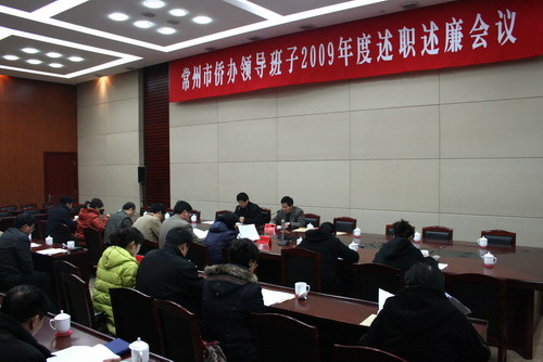 中新網12月22日電 據常州市僑辦消息,12月19日,江蘇省常州市僑辦領導班子2009年度述職述廉會議在行政中心青云廳召開。常州市、轄市、區僑辦主任、副主任,市僑辦全體機關干部,市僑辦機關作風監督員參加了會議。