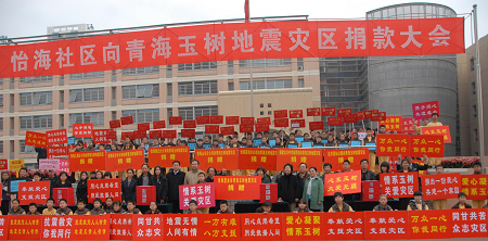 中新網4月23日電 據北京僑網消息,4月20日上午7時許,北京市豐臺區僑資企業北京怡海怡海置業集團在怡海社區隆重舉行抗震救災捐贈大會。怡海社區居民、公司員工、師生共計5000多人參加此次捐贈大會,共同為青海玉樹地震災區奉獻愛心。中國僑聯辦公廳副主任、中國華僑經濟文化基金會副理事長劉奇先生,怡海集團董事長王琳達女士等參加了本次捐贈大會。