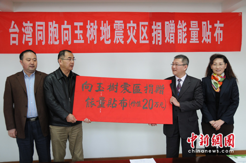 中新網北京4月28日電(記者 張冬冬)臺灣通德興業股份公司董事長陳前芳28日在此間向中國華僑經濟文化基金會捐贈價值20萬元人民幣的能量貼布,用以支援青海玉樹抗震救災。