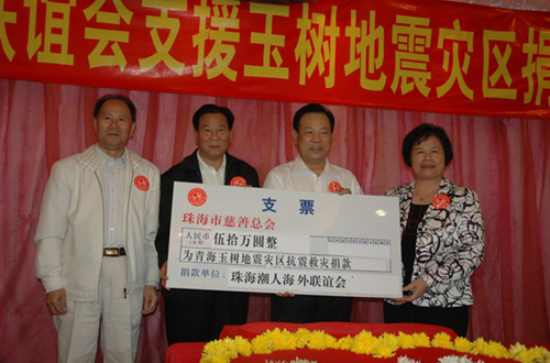 中新網4月30日電 據珠海僑務局消息,地震災情牽動著億萬中國人民的心,也受到珠海海外聯誼會的潮商們的高度關注。為積極支持玉樹的災后重建工作,繼08年汶川大地震該會捐資40萬元支持綿虒鎮涂禹山村重建格子巖組“僑心村”后,珠海潮人海外聯誼會又于4月27日舉辦現場捐款活動,呼吁珠海的廣大潮商伸出援手,募捐善款,幫助地震災區同胞,抗震救災、重建家園,為抗震救災行動貢獻一份力量。廣東省珠海市政協副主席、市委統戰部部長羅碧堅、市僑聯主席李清出席了捐贈儀式。