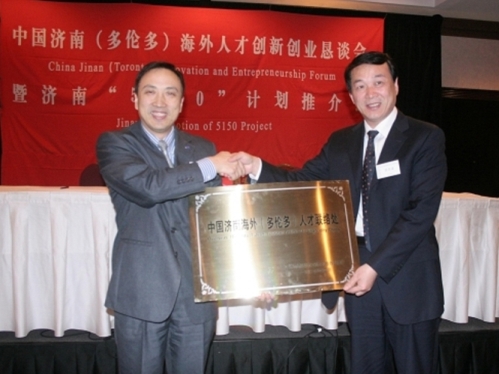 經(jīng)濟南僑辦多次聯(lián)絡(luò)協(xié)調(diào),在前期交流考察基礎(chǔ)上,濟南市政府分別與在當(dāng)?shù)赜杏绊憽⒂袑嵙Α⒃趦S界聯(lián)絡(luò)廣泛的美國華源科技協(xié)會、中國旅美科技協(xié)會、加拿大專業(yè)人士協(xié)會三家華僑華人科技社團,簽約設(shè)立濟南(硅谷)、濟南(紐約)、濟南(多倫多)三處人才引進聯(lián)絡(luò)處,殷魯謙為聯(lián)絡(luò)處授牌,為美加海外高層次人才到濟南創(chuàng)新創(chuàng)業(yè)搭建新的交流合作平臺。