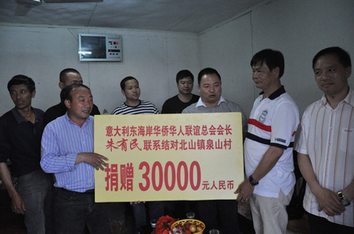 中新網(wǎng)5月28日電 據(jù)青田縣僑聯(lián)消息,5月26日,浙江省青田縣委常委、縣委辦公室主任楊雷陪同青田籍華僑、意大利東海岸華僑華人聯(lián)誼總會(huì)會(huì)長(zhǎng)朱有民,來到聯(lián)系其結(jié)對(duì)的北山鎮(zhèn)肖山村和泉山村,分別向兩村各捐贈(zèng)3萬元共計(jì)6萬元,用于改善村莊的基礎(chǔ)設(shè)施建設(shè)。