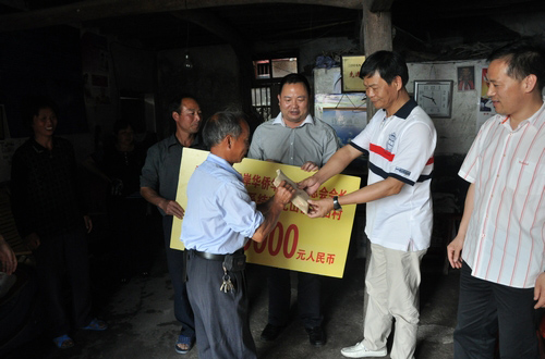 楊雷、朱有民一行人先后來到兩村,跟村兩委人員親切交談,了解村里的基本情況。肖山村全村800多人,有160多人留守在家,村民們主要收入來源就是稻田養(yǎng)魚和油茶培育。而泉山村全村也就70多戶村民,經(jīng)濟(jì)來源單一,生活生產(chǎn)困難。座談會(huì)上,村干部們就如何發(fā)展該村經(jīng)濟(jì)效益而暢所欲言,同時(shí)也提出了由于地處偏遠(yuǎn),經(jīng)濟(jì)發(fā)展不起來,資金不足而導(dǎo)致至今沒有一幢像樣的村委大樓等困難和問題。朱有民在了解情況后,毫不猶疑地向兩村各捐贈(zèng)了3萬元人民幣,用于村委大樓的建設(shè),并表示以后村里如果有問題和困難,他都會(huì)一直關(guān)注和支持的。