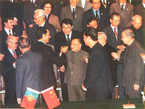 中共中央顧問委員會主任鄧小平與葡萄牙總理席爾瓦共同舉杯,慶賀中葡聯合聲明的簽署。