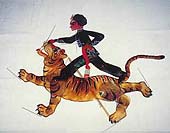 由于這種藝術歷史悠久,源遠流長,所以其流傳范圍極廣,名稱也不同;因其演員只有一人,故南方各省稱之為“單人班”;因表演時人藏在布帷之中,故四川省稱之為“被單戲”;又因以扁擔挑道具并支撐臨時搭起的小戲臺,故在河北吳橋等地稱為“扁擔戲”。有關傀儡戲的表演方式及特點,可見《揚州畫舫錄》中一段記載:“圍布作房,支以一木,以五指運三寸傀儡,金鼓喧鬧,詞、白皆用叫嗓子,均一人為之,謂之扁擔戲。”